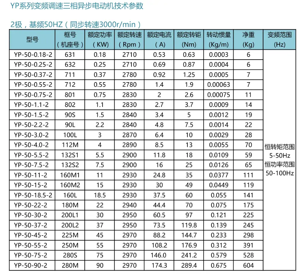 YP變頻系列2極型號: