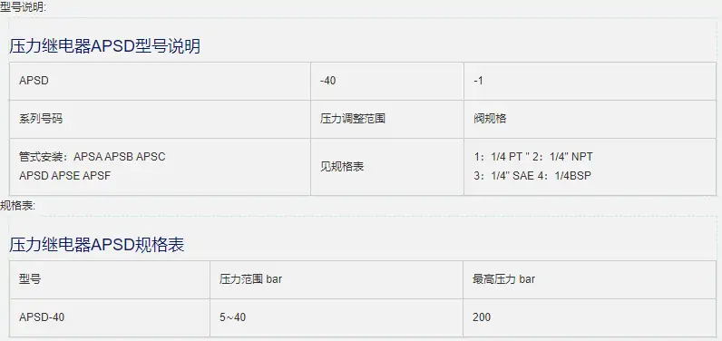壓力繼電器APSD有如下型號(hào):APSC-40-1,APSC-40-2,APSC-40-3,APSC-40-4。