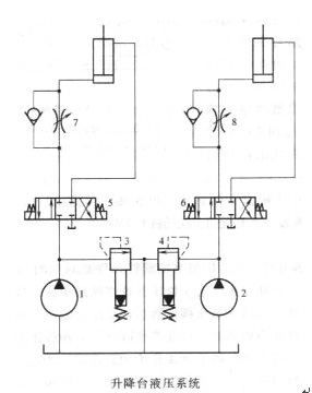 某工廠生產的設備安裝升降臺液壓系統如下圖所示,用雙泵雙回路控制兩個頂升液壓油缸,實現雙缸同時動作或單缸動作。兩個同路對應的液壓元件規格相同,管路通徑相同。