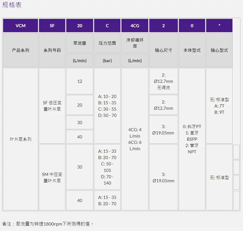 | 型號(hào) | 排量 (cc/rev) | 持續(xù)壓力 (MPa) | 峰值壓力 (MPa) | 轉(zhuǎn)速范圍 (rpm) | 流量 (L/min@1500rpm) |